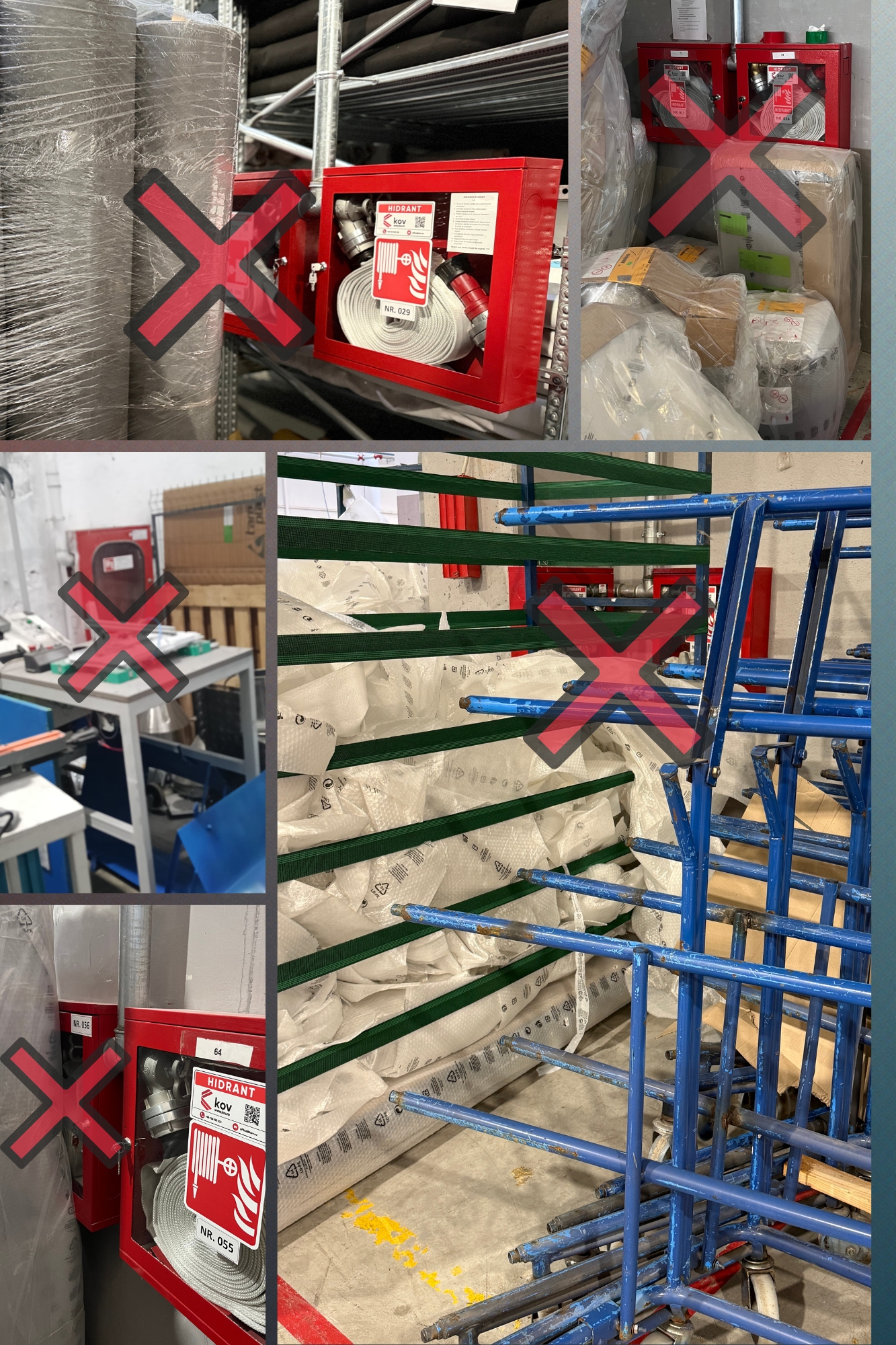 În multe spații industriale, depozite sau hale de producție, observăm din păcate aceeași problemă: sistemele de stingere a incendiilor – în special hidranții interiori, stingatoarele și panourile de intervenție – sunt blocate de marfă, utilaje sau ambalaje. Alteori, pentru a fi „protejate” de praf, vopsele sau alte substanțe utilizate în procesul de producție, aceste echipamente sunt acoperite cu saci sau folii.
